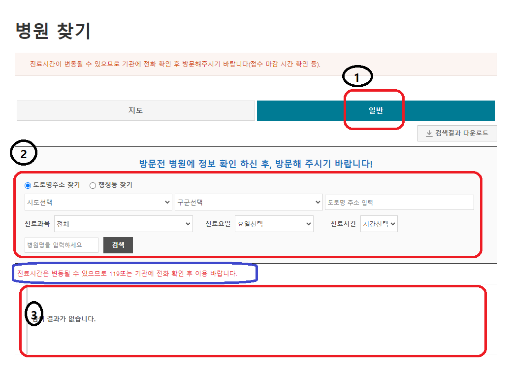 ② 주소 및 진료과목, 진료요일, 진료시간 입력 후 검색