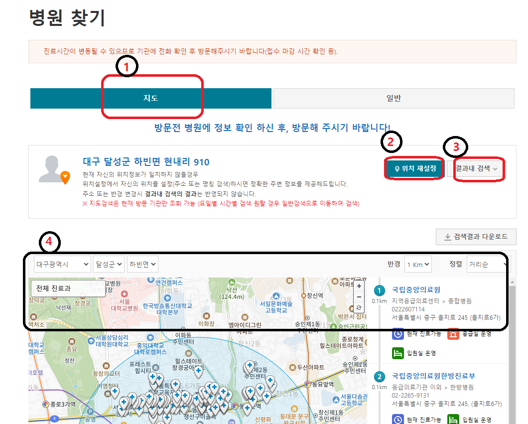 ④ 설정한 주소 근처의 병원을 볼 수 있습니다.